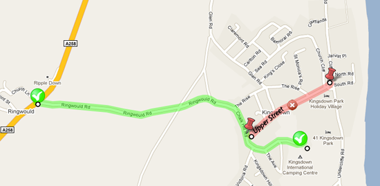 | Your address: | To: | Kingsdown International Camping Centre lat: 51.18258, long: 1.40065 |